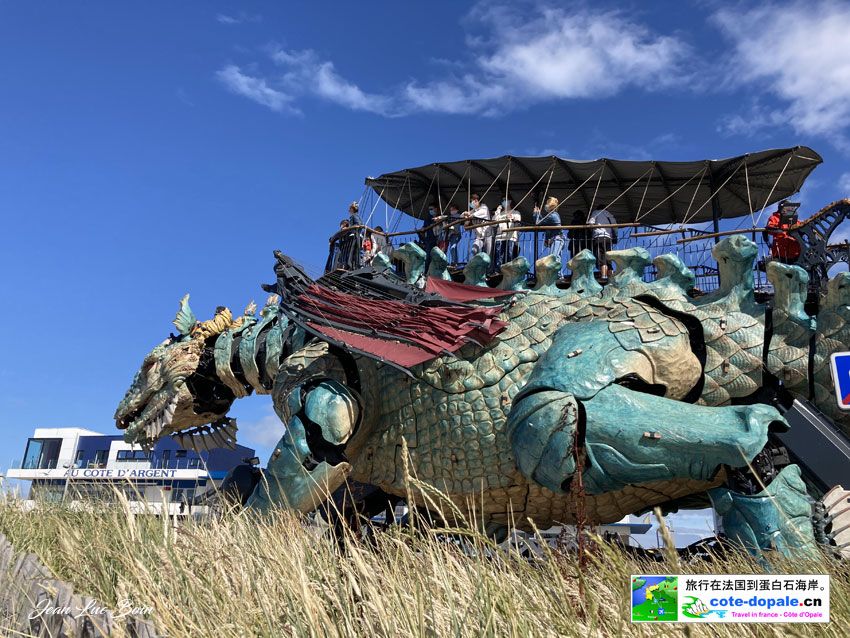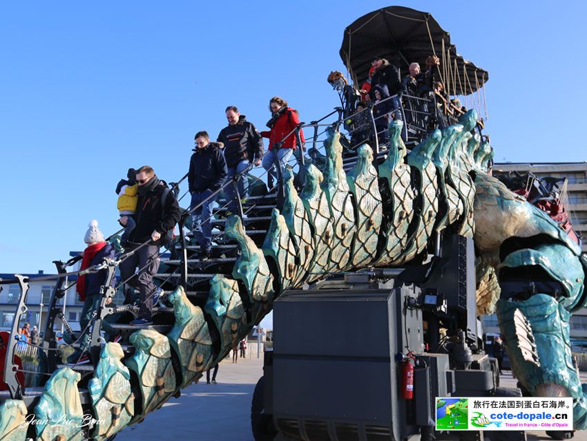 加来巨龙能够躺下,站起来,向后抬起,以每小时4公里的速度跑动并拍打翅膀! 他的眼睛,眼皮,耳朵,嘴巴,舌头,脚蹼也很灵活。 受艺术家François Delaroziere的邀请,根据加来市的要求,加来巨龙的背上可容纳50至60人的团体。 这是应加来市的要求而构想的伟大艺术和文化元素,它是穿越加来海滩堤坝的最新作品。