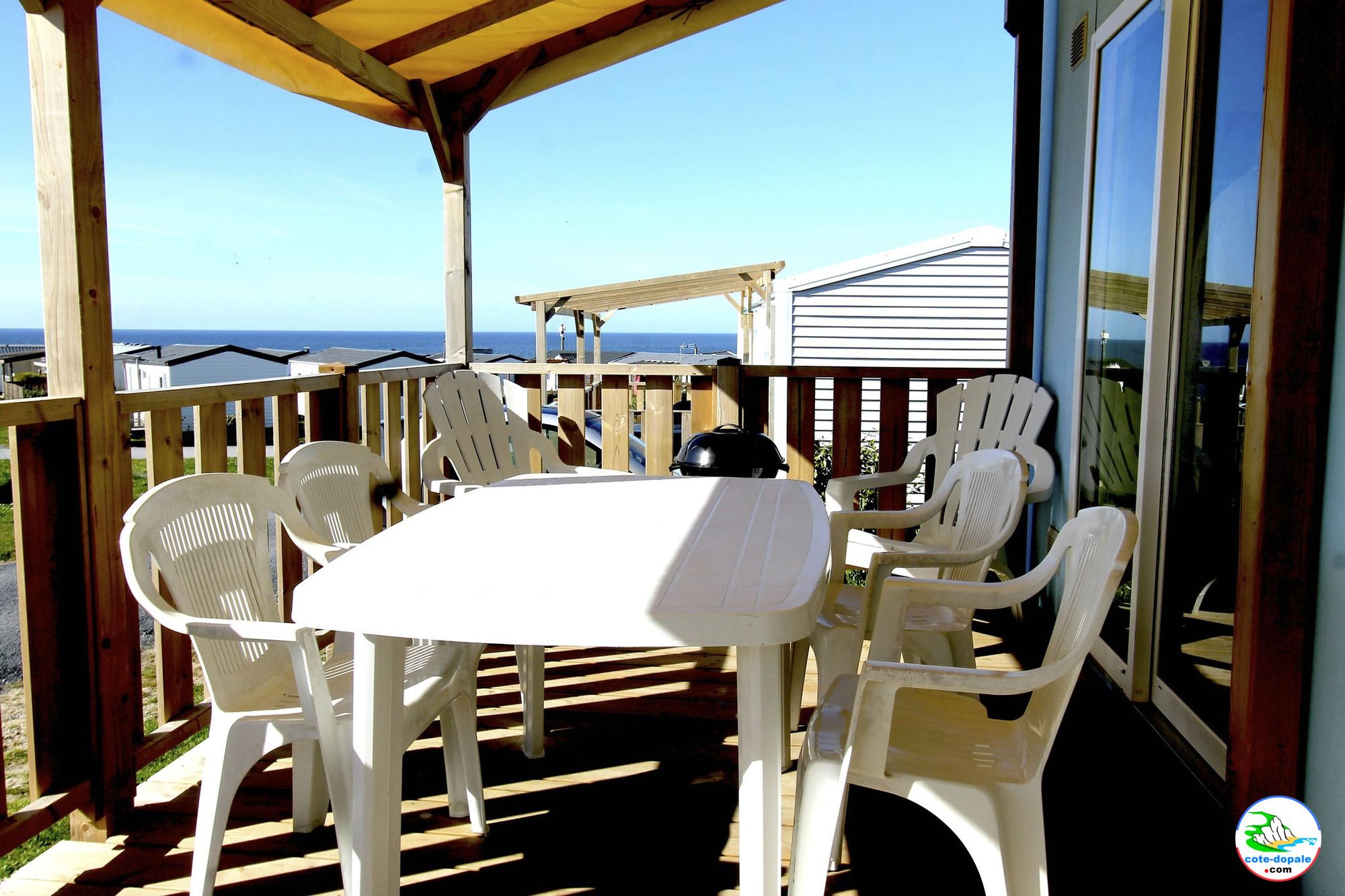 Mobil-home 6 personnes tout confort avec grande terrasse et vue sur mer.