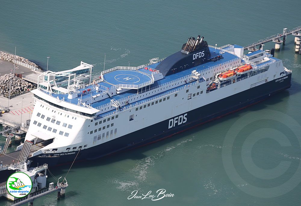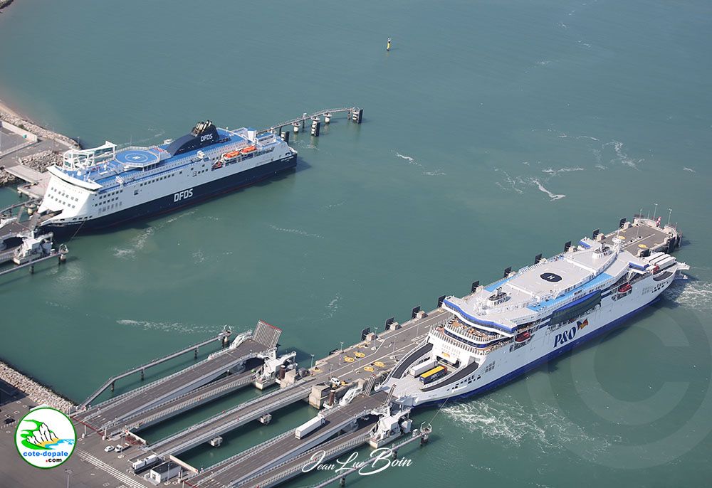 Port de Calais, les 3 compagnies de Car ferry ( DFDS , Irish Ferries , P&0 Ferries assurent la liaison entre Calais et Douvres jusqu'à 50 traversées par jours, 24h/24 et 7 j/7.
